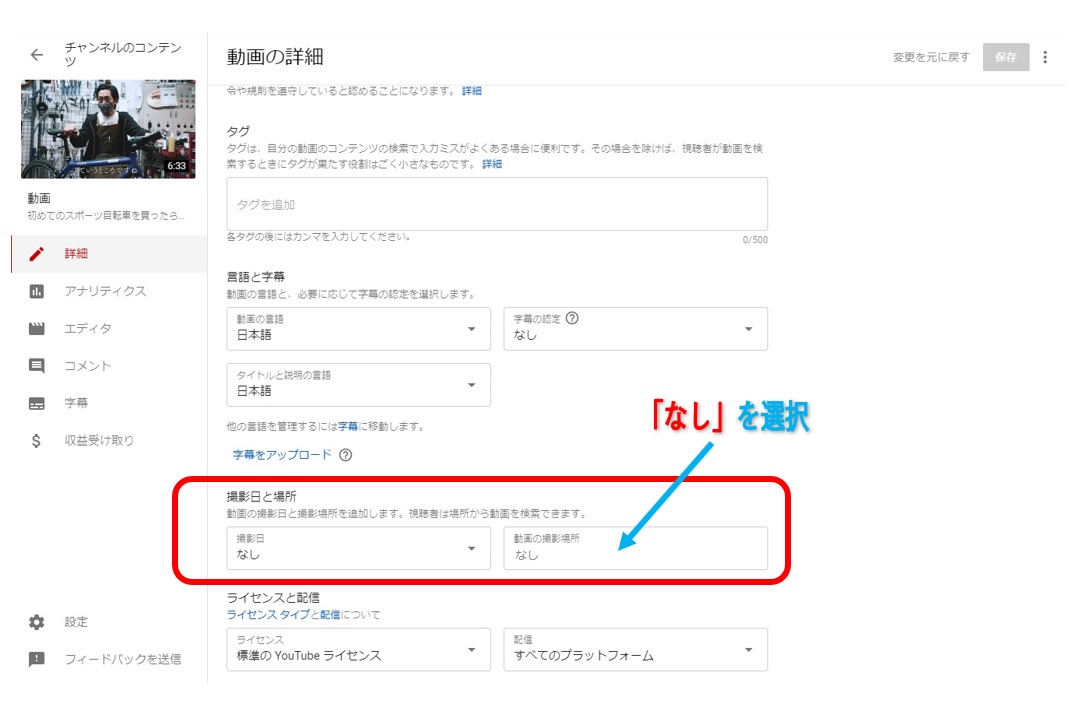 赤枠内の「動画の撮影場所」を【なし】に変更して更新してみてください。