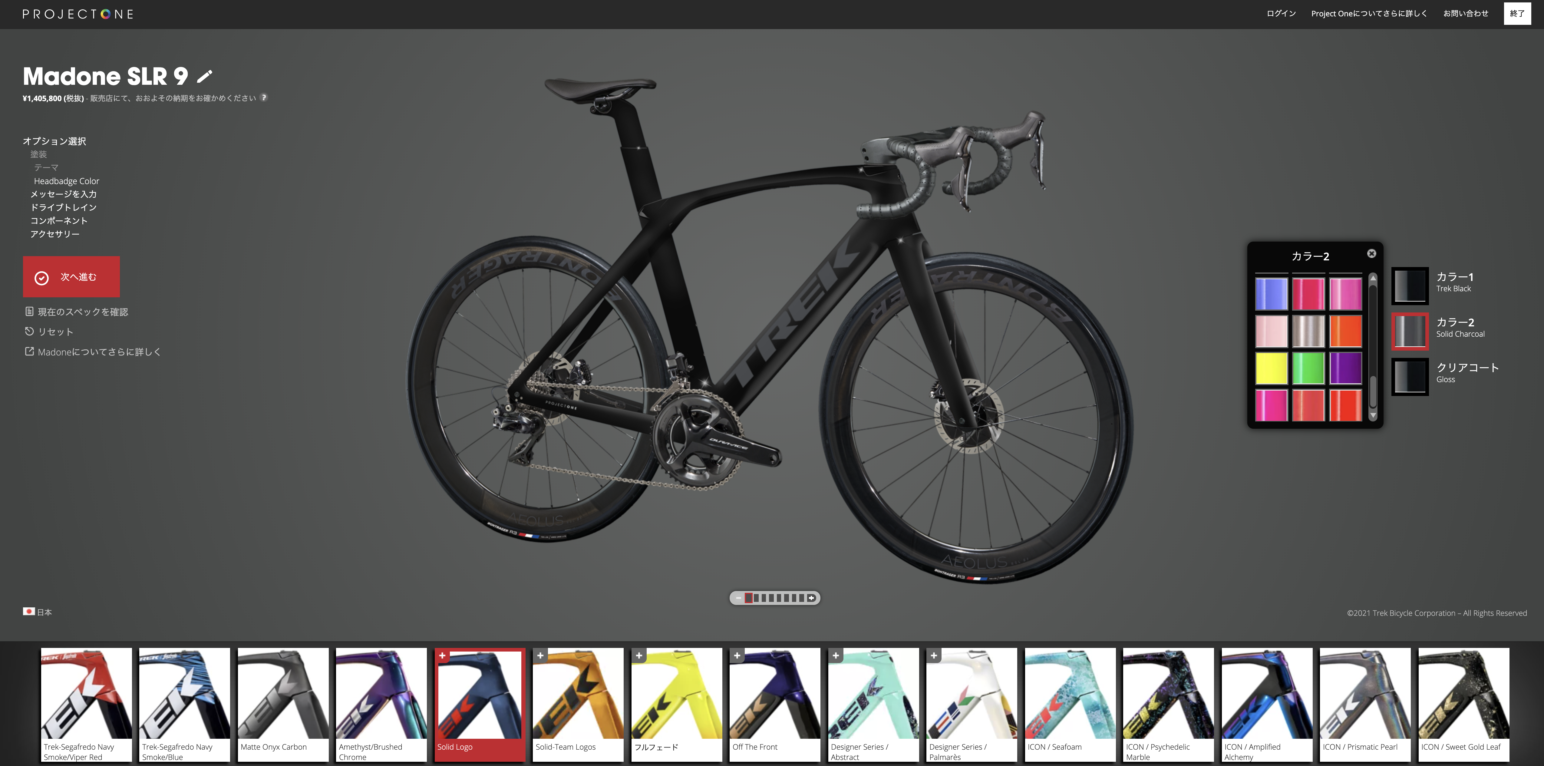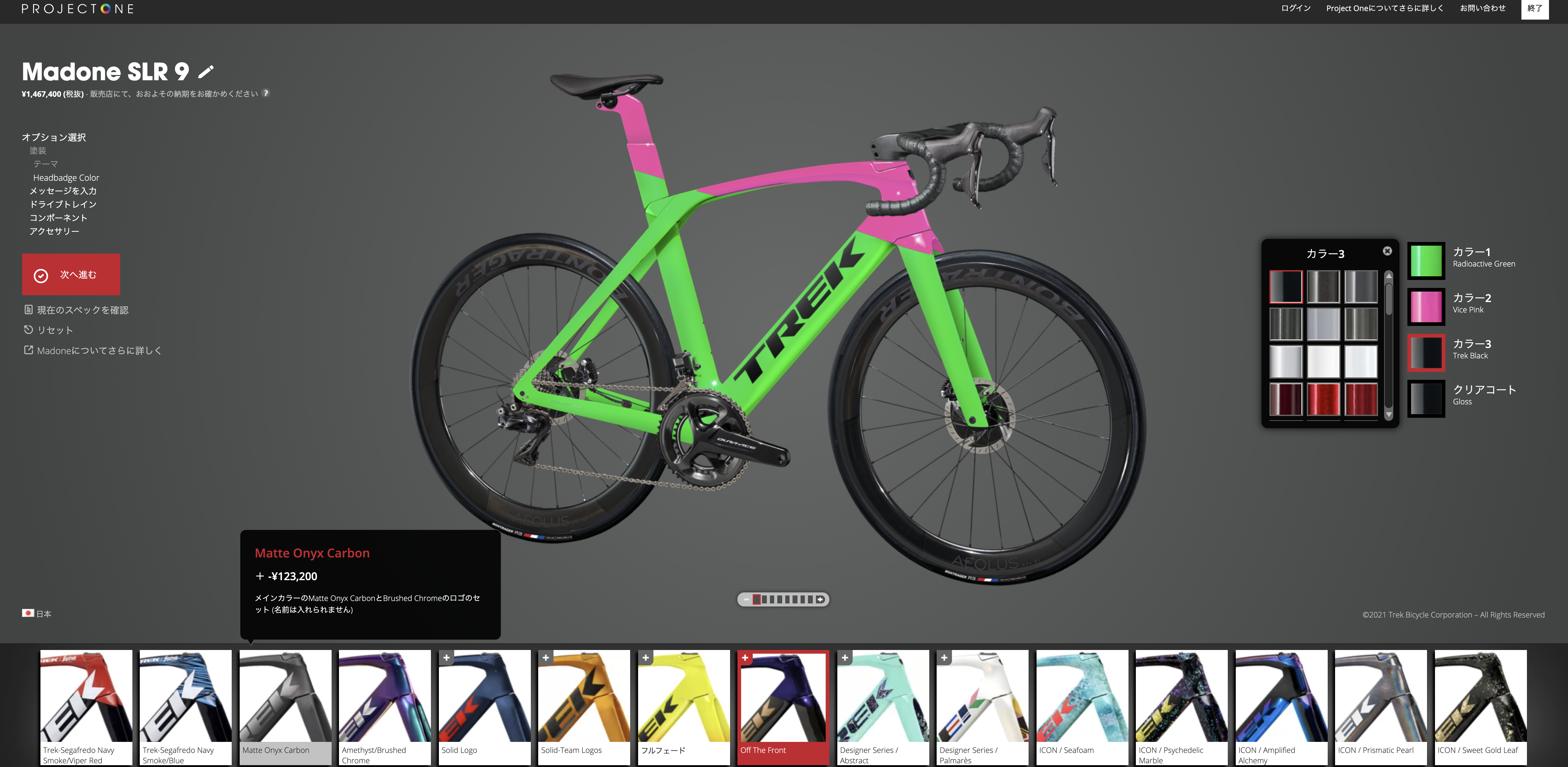 プロジェクトONEはトレックの一部モデルのグレードSLR以上に対応するカラーオーダーシステムで用意されたカラーパターンとそれに対応した色の中から自分お好きな色で自転車をオーダーできるものです。またコンポーネントやそれを構成するパーツを変更したりすることもできます。僕は大好きです。