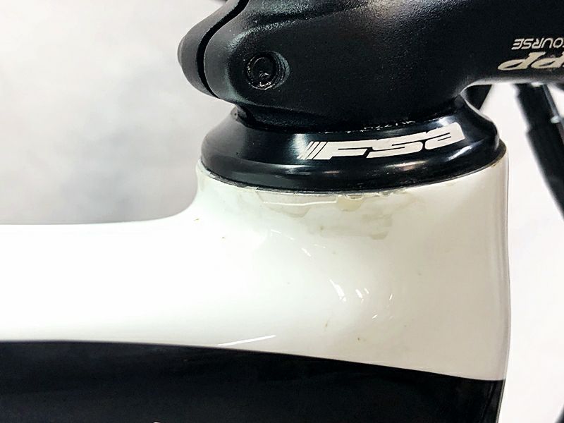 フレーム、その他外観:訳ありの理由は、チェーンにシマノ、チェーンリングにRIDEAが使われているため、変速性能が100%ではないためです。フレームエンド、フォークエンド、ホイール、シートポストにキズがあります。リアディレイラー、クランク、ブレーキレバー、サドルに小キズがあります。ヘッドチューブ上、スポークにハゲがあります。FD台座にクランプキズがあります。<br>その他フレームやパーツに傷や擦れ傷、汚れがあり、通常の使用感が感じられる車体です。
